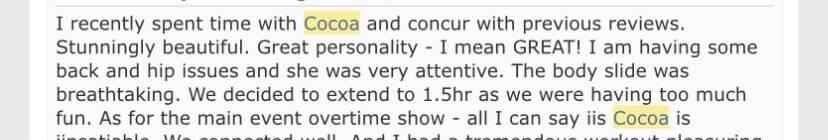 Hey Gentlemen. Let me give you a treat because you deserve the best I'm Cocoa, Calgary's elite ebony NURU Goddess. I'm fun, sophisticated, classy and charming, my sexy curves, pretty face, luscious lips and silk soft skin will have you hooked and coming back for more. Let me help you unwind, I love to tease and please and not shy at all. My role play, edging and flirting expertise provide for a one of a kind experience as I aim to fulfill your fantasies. Just come with your needs and leave your worries at the door. Your discretion and safety are my priority My Specialties include: NURU massage/ Hot oil body slide Swedish Massage Deep tissue Inverted Body Slide Reversals Steam room or Jacuzzi package OPEN MINDED: couples welcome, and multi hours available ***Text with introduction(Name and Age) |